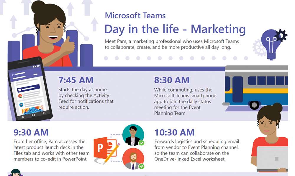 Meet Pam, a marketer who’s planning an event while running the rest of her marketing operation. She can check her activity feed at home before leaving for work to see the priorities for the day. She can join a status meeting remotely using Microsoft Teams and using OneDrive-lined documents she can share documents, co-edit files in PowerPoint, Excel and access outside apps like Adobe Creative Cloud, Hootsuite and much more.